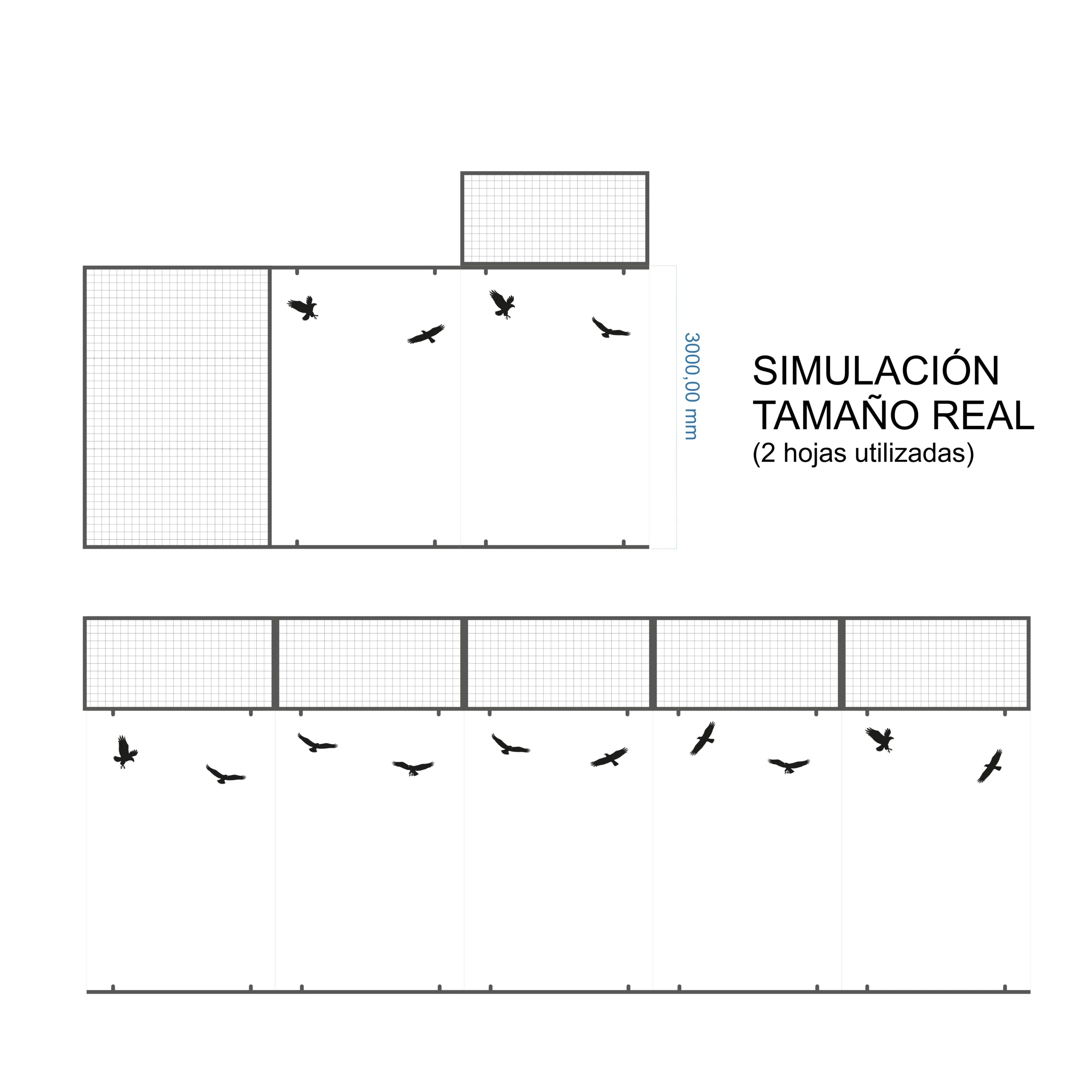 Cada lámina incluye 7 siluetas de aves rapaces en diferentes posiciones, lo que simula su presencia en vuelo. Este patrón visual advierte a las aves y evita que confundan el cristal con el entorno natural. El vinilo es resistente al exterior, fácil de instalar y no requiere mantenimiento.